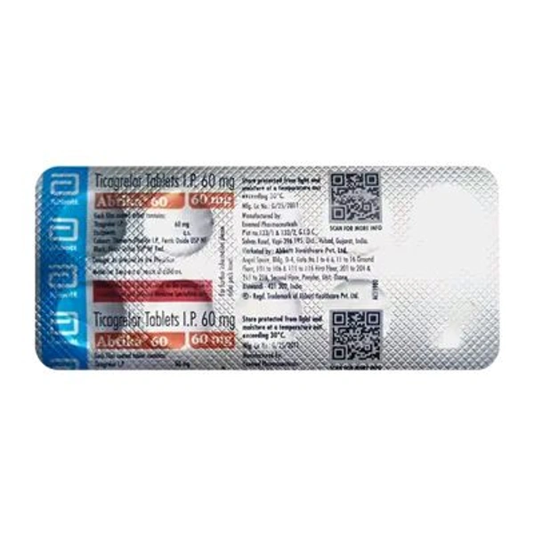 Abtika 60 Tablet 10's is taken to prevent heart attack or stroke in people at high risk of heart disease. It helps to prevent blood clots in people with acute coronary syndrome (heart doesn't receive enough oxygen) who have had stents placed in blood vessels in their heart. It contains Ticagrelor, which prevents blood clot formation in the blood vessels by making platelets less sticky. In some cases, you may experience dyspnea (shortness of breath), tightness in the chest, blurred vision, nosebleeds, dizziness, faintness, or lightheadedness. Before taking this medicine, you should tell your doctor if you are allergic to any of its components or if you are pregnant/breastfeeding, and about all the medications you are taking and pre-existing medical conditions.