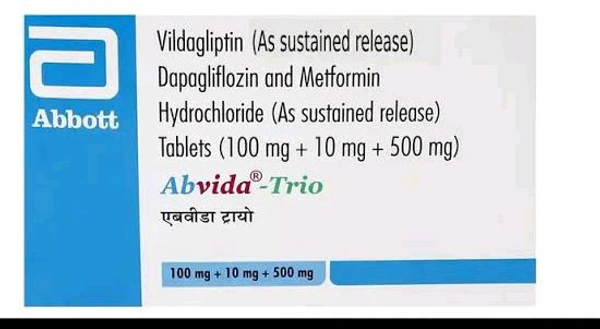 Abvida-Trio 100/10/500 mg Tablet is an antidiabetic medicine used to treat Type II Diabetes. It contains Dapagliflozin (sodium-glucose cotransporter-2 inhibitors), Vildagliptin (dipeptidyl peptidase-4 inhibitor), and Metformin (biguanides), which work by increasing the amounts of certain natural substances that lower blood sugar when it is high. Abvida-Trio 100/10/500 mg Tablet may cause side effects, such as vomiting, nausea, abdominal pain, headache, frequent urination, and allergic reactions