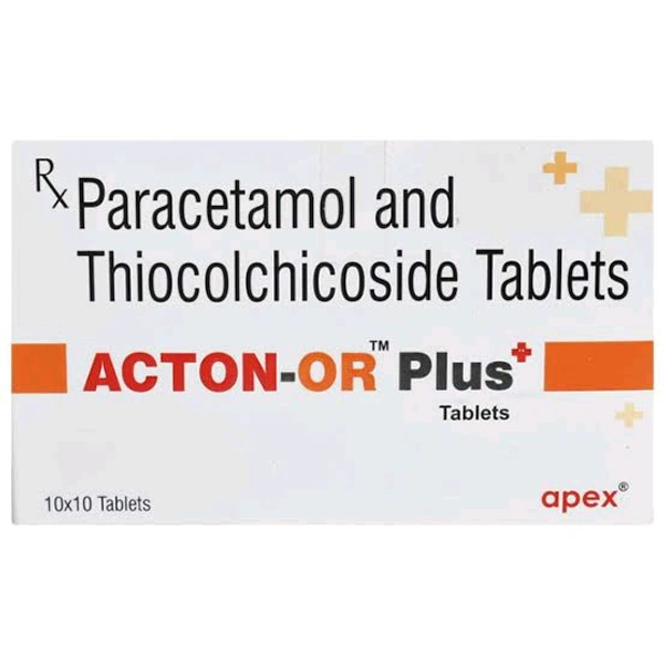 Acton-OR Plus Tablet is used to reduce and relieve orthopaedic, traumatic, and rheumatologic disorders. It helps relieve muscle spasms (painful muscular contractions) associated with degenerative vertebral disorders, vertebral static problems, dorsal pain, low back pain, and torticollis (neck muscle contractions). It contains Paracetamol and Thiocolchicoside, which works by inhibiting certain chemical messengers in the brain known as prostaglandins responsible for pain, inflammation and fever. Also, it acts on the centres of the spinal cord and brain and helps relieve muscle stiffness and improves muscle movements, thereby relieves pain due to muscle spasms. In some cases, it may cause side effects such as diarrhoea, drowsiness or stomach pain.
