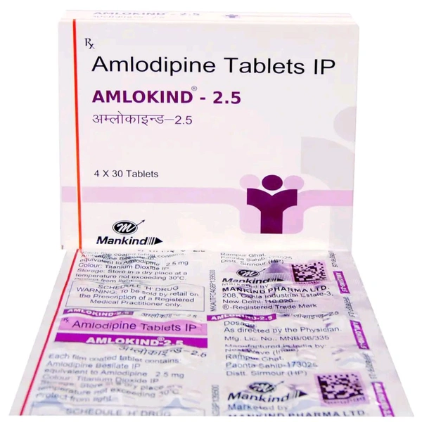 Amlokind-2.5 Tablet is used for the treatment of hypertension (high blood pressure) and angina (chest pain). It contains Amlodipine, which acts by relaxing the blood vessels. This reduces the workload on the heart and makes the heart more efficient at pumping blood throughout the body. Thus, it helps to lower high blood pressure, reducing the chances of heart attack or stroke. It may cause common side effects like headache, feeling exhausted and swollen ankles. Before taking this medicine, you should tell your doctor if you are allergic to any of its components or if you are pregnant/breastfeeding, and about all the medications you are taking and pre-existing medical conditions.
