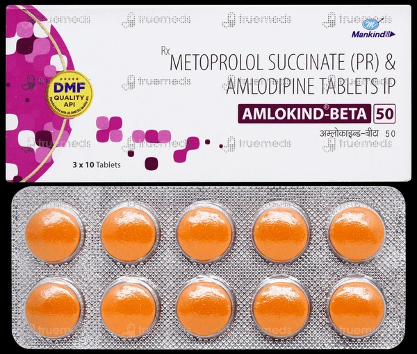 Amlokind Beta 50 Tablet is used to treat hypertension (increased blood pressure). It contains Amlodipine and Metoprolol, which widens and relaxes the blood vessels, making the heart more efficient at pumping blood throughout the body. Thus, it helps to lower high blood pressure, reducing the chances of heart attack or stroke. It is generally safe to consume. Some people may experience side effects such as nausea, vomiting, diarrhoea, fatigue, headache, low heart rate, and breathlessness. Before taking this medicine, you should tell your doctor if you are allergic to any of its components or if you are pregnant/breastfeeding, and about all the medications you are taking and pre-existing medical conditions