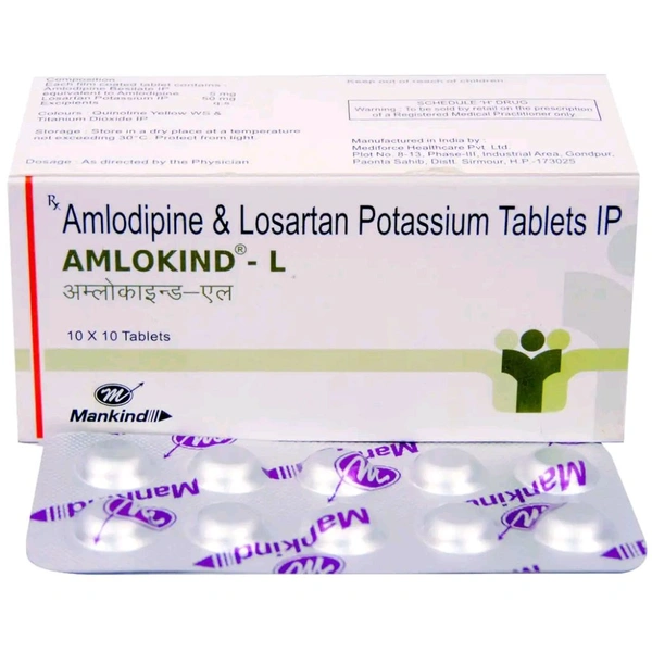 Amlokind-L Tablet is used to treat high blood pressure (hypertension). It contains Losartan and Amlodipine, which lowers the blood pressure and increases the blood flow by preventing the narrowing of blood vessels. It dilates (widens) blood vessels and increases blood flow. In some cases, it may cause side effects like sleepiness, taste changes, ankle swelling, headache, flushing (feeling warmth in the face, ears, neck and trunk), dizziness, tiredness, palpitations (irregular heartbeat), upset stomach, and hyperkalaemia (increased potassium levels in the blood). Before taking this medicine, you should tell your doctor if you are allergic to any of its components or if you are pregnant/breastfeeding, and about all the medications you are taking and pre-existing medical conditions.