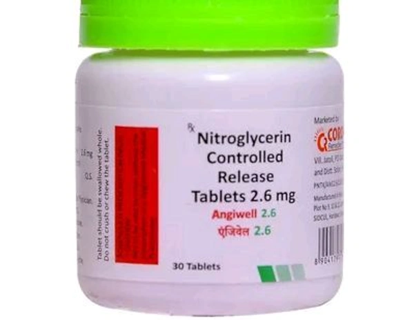 Angiwell CR 2.6 Tablet is used to prevent and treat angina (chest pain). It contains Nitroglycerin, which works by relaxing the blood vessels and lowering the workload on the heart. Sometimes, you may experience side effects such as dry mouth, headache, blurred vision, insomnia, tingling, and prickling sensations. Before taking this medicine, you should tell your doctor if you are allergic to any of its components or if you are pregnant/breastfeeding, and about all the medications you are taking and pre-existing medical conditions.