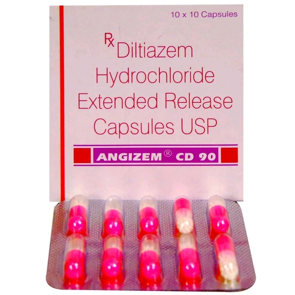 Angizem CD 90 Capsule is used to treat mild to moderate hypertension (high blood pressure). It is also indicated in the management of chronic stable angina and angina due to coronary artery spasms. It contains Diltiazem, which works by relaxing the blood vessels in the heart and thereby reducing the raised blood pressure. It eases anginal chest pain by preventing the narrowing of blood vessels and dilating the coronary arteries. In some cases, you may experience certain common side effects, such as swelling in the hands, feet, and ankles, headache, dizziness, palpitations, constipation, and indigestion. Before taking this medicine, you should tell your doctor if you are allergic to any of its components or if you are pregnant/breastfeeding, and about all the medications you are taking and pre-existing medical conditions.