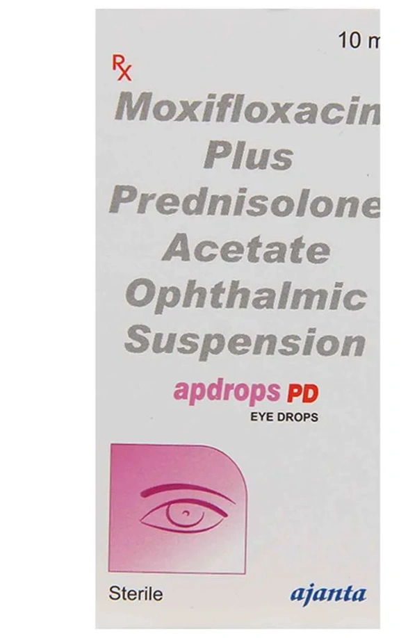Apdrops PD Eye Drop is used to treat bacterial eye infections. It contains Moxifloxacin and Prednisolone which work by inhibiting bacterial growth and reducing inflammation. In some cases, this medicine may cause side effects such as temporary blurred vision. Avoid touching the container's tip to the eye, eyelids, or surrounding areas as it may contaminate the product.