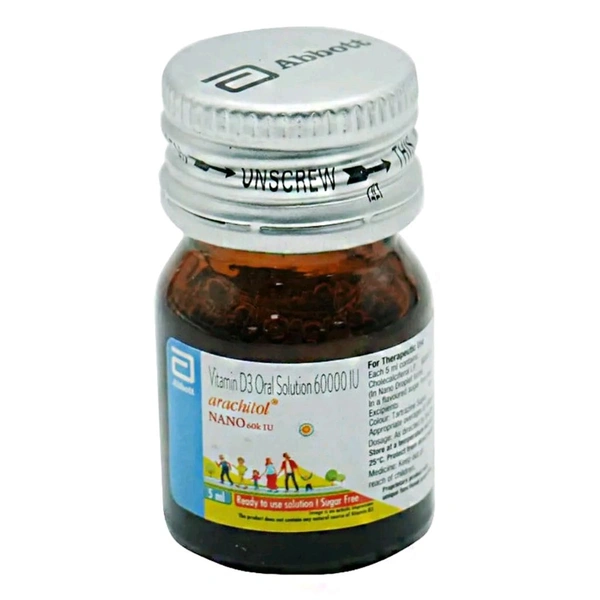 Arachitol Nano Oral Solution 4 x 5 ml used to prevent/treat vitamin D deficiency. It contains Cholecalciferol, which increases vitamin D levels in the body. In some cases, this medicine may cause side effects such as vomiting, nausea, constipation, and increased calcium levels in blood and urine. Inform the doctor if you are pregnant or breastfeeding, taking any other medication, or have any pre-existing medical conditions.