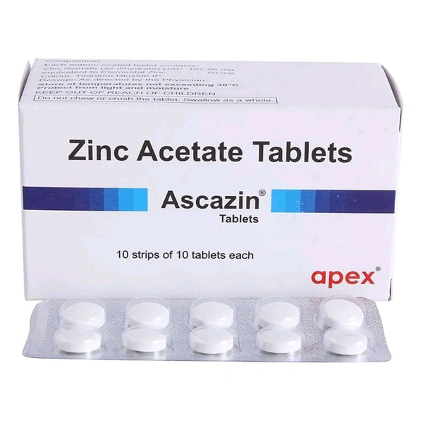 Ascazin Tablet is used to treat and prevent zinc deficiency. It contains zinc which strengthens the immune system and aids growth and maintenance of good health. In some cases, this medicine may cause side effects such as regurgitation, nausea, vomiting, diarrhoea, stomach pain, and indigestion. Inform the doctor if you are pregnant or breastfeeding, taking any other medication, or have any pre-existing medical conditions.