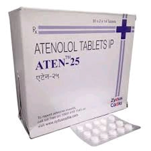Aten 25 Tablet belongs to a group of medicines called beta-blockers. It is used to treat high blood pressure (hypertension), angina (heart-related chest pain), irregular heart rhythms (arrhythmia). It also helps to prevent future heart attacks and stroke.