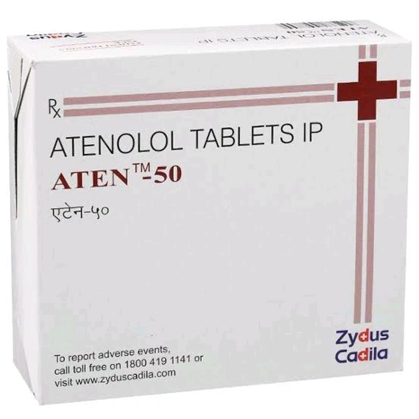 Aten 50 Tablet belongs to a group of medicines called beta-blockers. It is used to treat high blood pressure (hypertension), angina (heart-related chest pain), irregular heart rhythms (arrhythmia). It also helps to prevent future heart attacks and stroke.