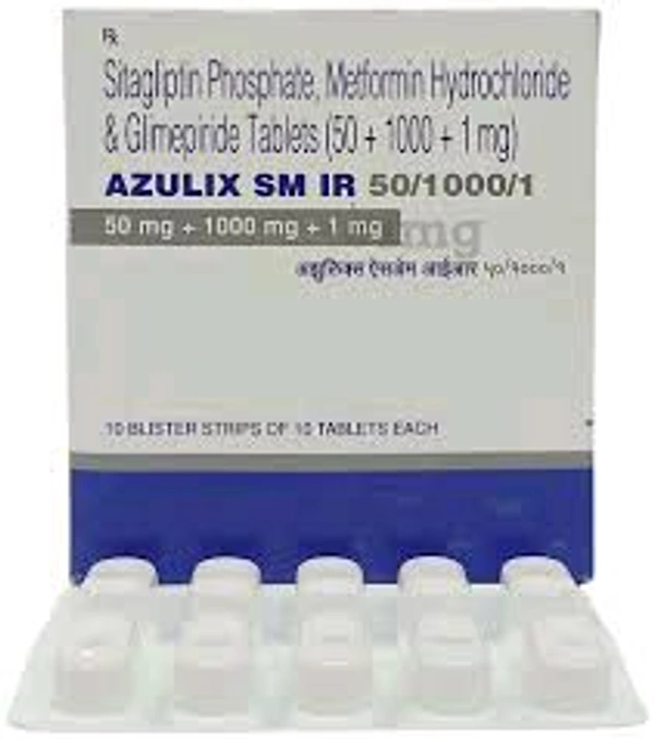 Azulix SM 50mg/1mg/1000mg Tablet IR is a combination of three medicines used to lower blood glucose levels in people with type 2 diabetes mellitus. It is generally prescribed when diet, exercise, and other treatments do not result in adequate glycemic control.