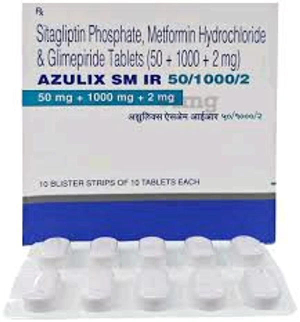 Azulix SM 50mg/2mg/1000mg Tablet IR is a combination of three medicines used to lower blood glucose levels in people with type 2 diabetes mellitus. It is generally prescribed when diet, exercise, and other treatments do not result in adequate glycemic control.