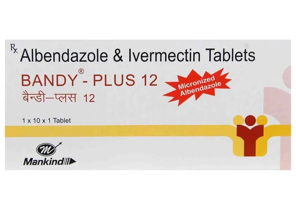 Bandy-Plus 12 Tablet is used to treat parasitic worm infections. It can be used to treat infections caused by roundworms, hookworms, threadworms, whipworms, pinworms, flukes, and other parasites. It contains Albendazole and Ivermectin, which work by keeping the worm from taking glucose and depleting its energy levels, leading to its immobilization. Also, it can kill the parasites by acting on the nervous system. It starves the worms by inducing paralysis, consequently leading them to death. It may cause common side effects such as stomach pain, nausea, vomiting, headache, dizziness, decrease in white blood cell count (leucopenia), vision problems, confusion, weakness, and difficulty walking. Before taking this medicine, you should tell your doctor if you are allergic to any of its components or if you are pregnant/breastfeeding, and about all the medications you are taking and pre-existing medical conditions.