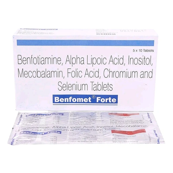 Benfomet Forte Tablet is a nutritional supplement that nourishes the body with essential vitamins and minerals. It treats nutritional deficiency and contains Folic acid, Methylcobalamin (Vitamin B12), Alpha-lipoic acid, Benfotiamine, Chromium, Inositol, and Selenium. It is indicated to treat nerve pain and damage in peripheral neuropathy, diabetic neuropathy (nerve damage due to high blood sugar levels), and alcoholic neuropathy. It relieves symptoms like numbness, tingling, burning, and needle-like sensations in the hands and feet. It works as an antioxidant and prevents cell damage due to free radicals. It is also used in conditions like panic disorders, weight loss, and high cholesterol levels.