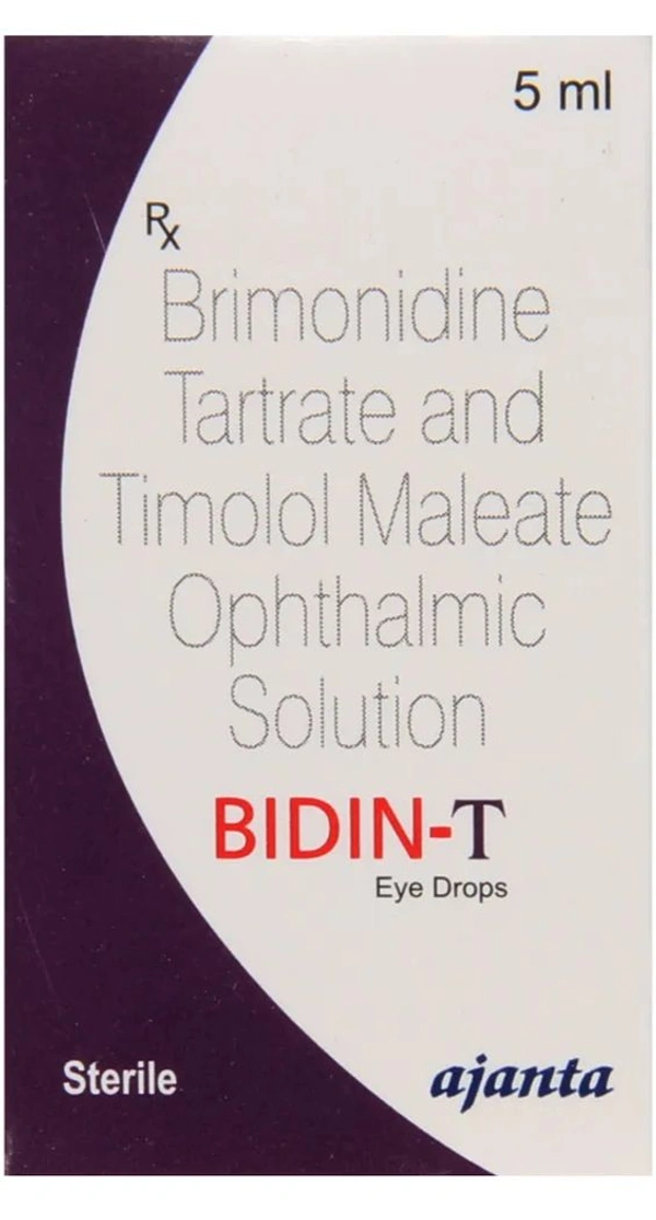 Bidin-T Eye Drops 5ml is used to treat open-angle glaucoma and (ocular hypertension) high pressure in the eyes. It contains Brimonidine and Timolol. It acts by narrowing the blood vessels that reduce the flow of aqueous humour. Also, it decreases the secretion of aqueous humour by acting on ciliary body in the eye, thereby causing a decrease in the eye pressure. It may cause some common side effects such as itching, stinging sensation, foreign body sensation in the eye, burning sensation in eye, redness, blurred vision, tiredness, drowsiness, headache, and dryness in the mouth. Before using this medicine, you should tell your doctor if you are allergic to any of its components or if you are pregnant/breastfeeding, and about all the medications you are taking and pre-existing medical conditions.