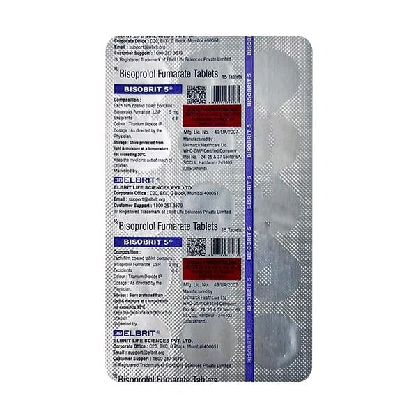 Bisobrit T 5 Tablet 15's is used to treat hypertension. It contains Bisoprolol and telmisartan. Bisoprolol is a beta blocker that acts directly on the heart to lower blood pressure and heart rate. Telmisartan is an angiotensin receptor blockers (ARBs). It relaxes blood vessels by inhibiting the angiotensin hormone. When combined, they improve the heart's pumping efficiency and blood flow. This medication may cause headaches, exhaustion, sore back, diarrhoea, congested feeling, and swollen ankles.