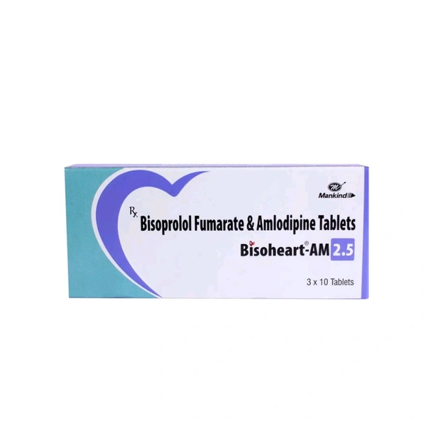 Bisoheart AM 2.5 Tablet is used to treat high blood pressure. It contains Amlodipine and Bisoprolol, which acts by relaxing the blood vessels. This reduces the workload on the heart and makes the heart more efficient at pumping blood throughout the body. Thus, it helps in reducing the risk of having a stroke, heart attack, other heart problems, or kidney problems in the future. It may cause common side effects like headaches, feeling exhausted, and swollen ankles. Before taking this medicine, you should tell your doctor if you are allergic to any of its components or if you are pregnant/breastfeeding, and about all the medications you are taking and pre-existing medical conditions.