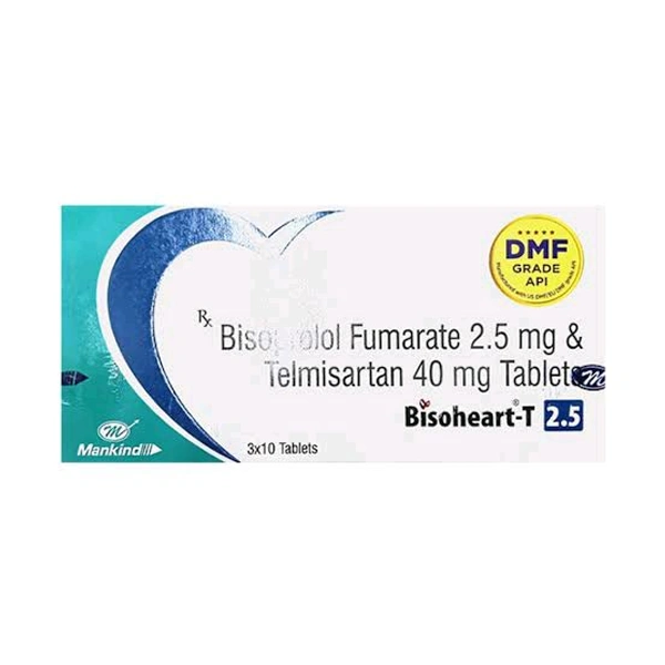 Bisoheart-T 2.5 Tablet is used to treat hypertension. It contains Bisoprolol and telmisartan. Bisoprolol is a beta blocker that acts directly on the heart to lower blood pressure and heart rate. Telmisartan is an angiotensin receptor blockers (ARBs). It relaxes blood vessels by inhibiting the angiotensin hormone. When combined, they improve the heart's pumping efficiency and blood flow. This medication may cause headaches, exhaustion, sore back, diarrhoea, congested feeling, and swollen ankles.