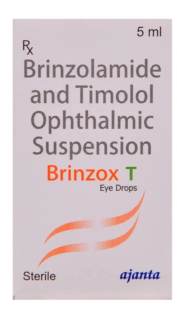 Brinzox T Eye Drops 5 ml is used to treat glaucoma (damage of the optic nerve) and ocular hypertension (high fluid pressure in the eye). It works by decreasing the secretion of aqueous humour (a liquid that maintains normal pressure in the eyeball). In some cases, this medicine may cause side effects such as redness, burning, itching, irritation, blurred vision or eye pain. Avoid touching the container's tip to the eye, eyelids, or surrounding areas as it may contaminate the product.