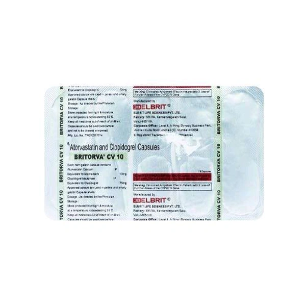 Britorva CV 10mg/75mg Capsule is a combination of two medicines used to prevent heart attack and stroke. This medicine reduces the "bad" cholesterol (LDL) and triglycerides (fats) levels. Moreover, it also decreases the formation of blood clots.