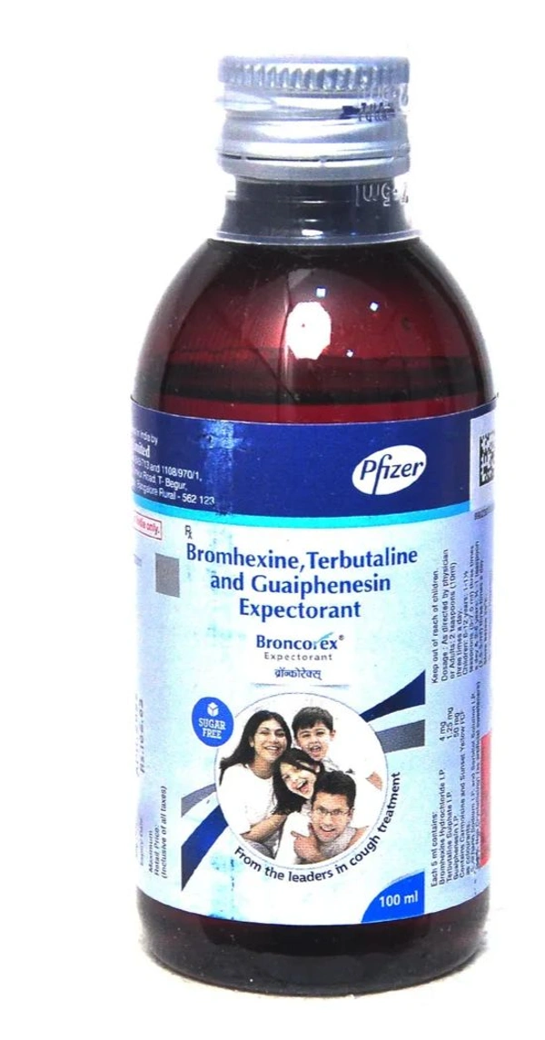 Broncorex Expectorant is used to treat cough associated with mucus. It works by increasing the volume of fluid in the airways, reducing the stickiness of mucus and helping to remove it from the airways. Also, it relaxes muscles and widens the airways. Thereby, it makes breathing easier. It thins and loosens phlegm (mucus) in lungs, windpipe and nose. Thus, it helps cough out easily. Some people may experience side effects such as nausea, vomiting, drowsiness, headache, dizziness, skin rash, tremor, stomach upset and fast heartbeats. Before taking this medicine, you should tell your doctor if you are allergic to any of its components or if you are pregnant/breastfeeding, and about all the medications you are taking and pre-existing medical conditions