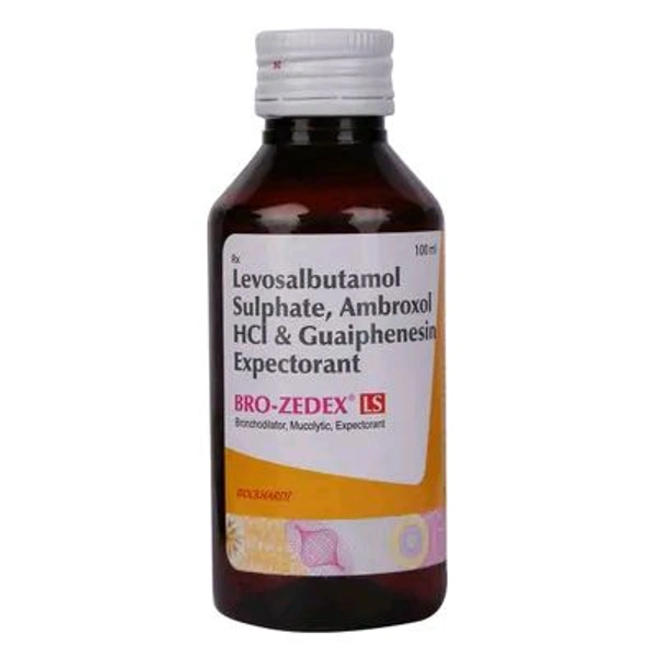 Bro-Zedex LS Expectorant is used to treat cough associated with mucus. It works by relaxing muscles and widening the airways of the lungs. It thins and loosens phlegm (mucus) in the lungs, windpipe, and nose. Thereby, helping to cough up easily. It works by increasing the volume of fluid in the airways, reducing the stickiness of mucus, and helping to remove it from the airways. Some people may experience nausea, vomiting, drowsiness, headache, dizziness, skin rash, tremor, stomach upset and diarrhoea. Before taking this medicine, you should tell your doctor if you are allergic to any of its components or if you are pregnant/breastfeeding, and about all the medications