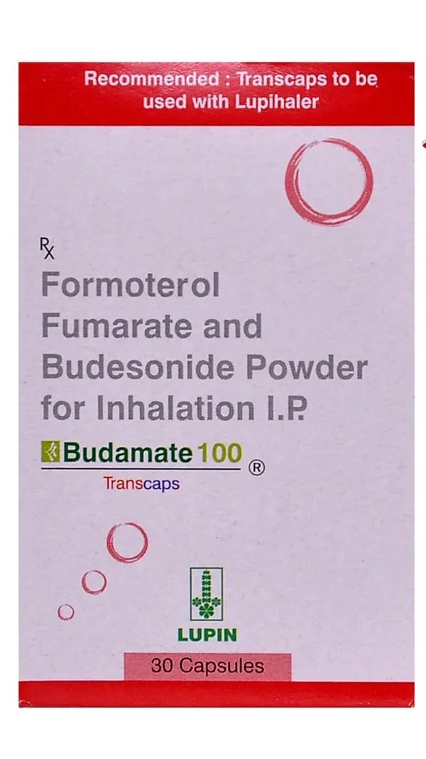 Budamate 100 Transcaps is used to treat asthma symptoms and chronic obstructive pulmonary diseases (COPD). It contains Budesonide and Formoterol, which works by reducing the irritation and swelling by acting inside the nasal passage and airways lining cells and stopping the release of certain chemicals responsible for causing inflammatory reactions and allergies. Thereby, it provides relief from sneezing, runny or blocked nose and sinus discomfort. Also, it relaxes and widens respiratory airway muscles, making it easier for asthma and COPD patients to breathe. Some people may experience side effects such as fungal infection in the mouth, headache, sore throat, hoarse voice, upper respiratory tract infection, flu, cough, back pain, increased heart rate, and trembling. Before taking this medicine, you should tell your doctor if you are allergic to any of its components or if you are pregnant/breastfeeding, and about all the medications you are taking and pre-existing medical conditions.