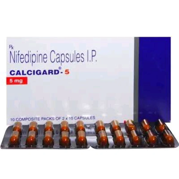 Calcigard 5 Capsule is a medicine used to treat high blood pressure (hypertension) and to prevent angina (heart-related chest pain). It belongs to a class of medicines known as calcium channel blockers. It lowers blood pressure and reduces the workload of the heart. This helps prevent heart attacks and strokes