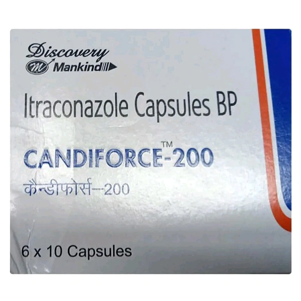 Candiforce-200 Capsule is an antifungal medicine used to treat fungal infections of the mouth, throat, toenails, fingernails or lungs. It contains Itraconazole, which works by killing fungi. Some people may experience side effects such as nausea, headache, diarrhoea, tiredness, cough, cold, throat pain, back pain and stomach pain. Before taking this medicine, you should tell your doctor if you are allergic to any of its components or if you are pregnant/breastfeeding, and about all the medications you are taking and pre-existing medical conditions.