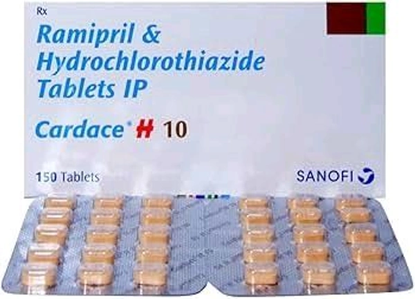 Cardace H 10 Tablet is a combination medication used to treat high blood pressure (hypertension) when a single agent is insufficient. It combines Ramipril (an ACE inhibitor) and Hydrochlorothiazide (a diuretic) to relax blood vessels and remove excess fluid, helping to lower blood pressure, improve heart efficiency, and prevent stroke or heart attack.