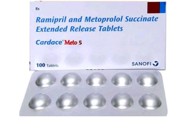 Cardace Meto 5 Tablet ER (5mg Ramipril + 50mg Metoprolol) is a prescription medicine used to treat high blood pressure (hypertension) in adults. By combining an ACE inhibitor and a beta-blocker, it relaxes blood vessels and slows the heart rate, reducing the risk of heart attacks, strokes, and cardiovascular complications.