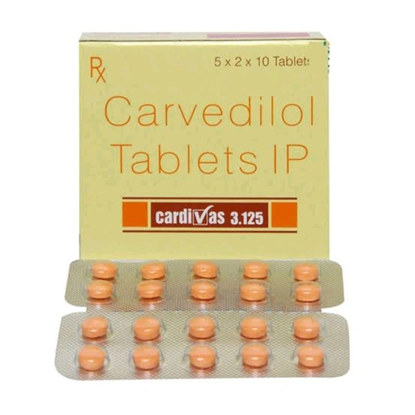 Cardivas 3.125 Tablet is a medicine used to treat high blood pressure, heart-related chest pain (angina), and heart failure. It works by relaxing the blood vessels, so blood can flow more easily to the heart. Lowering blood pressure also helps prevent future heart attacks and stroke.