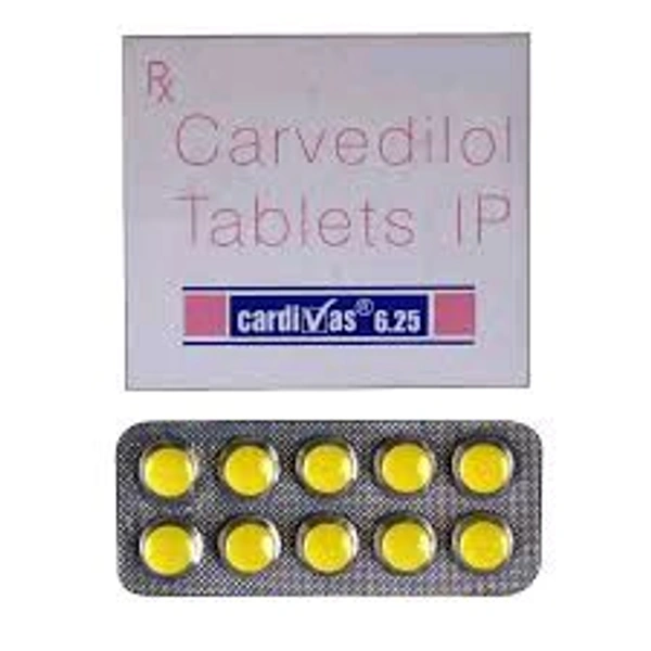 Cardivas 6.25 Tablet is a medicine used to treat high blood pressure, heart-related chest pain (angina), and heart failure. It works by relaxing the blood vessels, so blood can flow more easily to the heart. Lowering blood pressure also helps prevent future heart attacks and stroke.