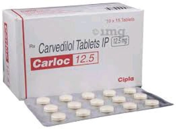 Carloc 12.5 Tablet is a medicine used to treat high blood pressure, heart-related chest pain (angina), and heart failure. It works by relaxing the blood vessels, so blood can flow more easily to the heart. Lowering blood pressure also helps prevent future heart attacks and stroke.