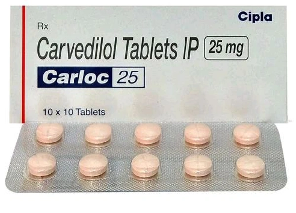 Carloc 25 Tablet is a medicine used to treat high blood pressure, heart-related chest pain (angina), and heart failure. It works by relaxing the blood vessels, so blood can flow more easily to the heart. Lowering blood pressure also helps prevent future heart attacks and stroke.