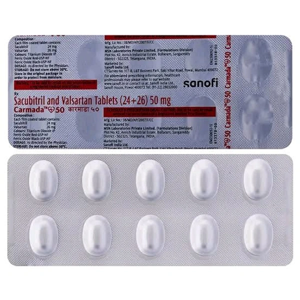 Carmada 50 Tablet is a combination of two medicines used to treat heart failure. It works by improving heart function, lowering blood pressure, and reducing the risk of hospitalization and death in patients with long-lasting (chronic) heart failure. It is usually taken along with other heart failure medicines.