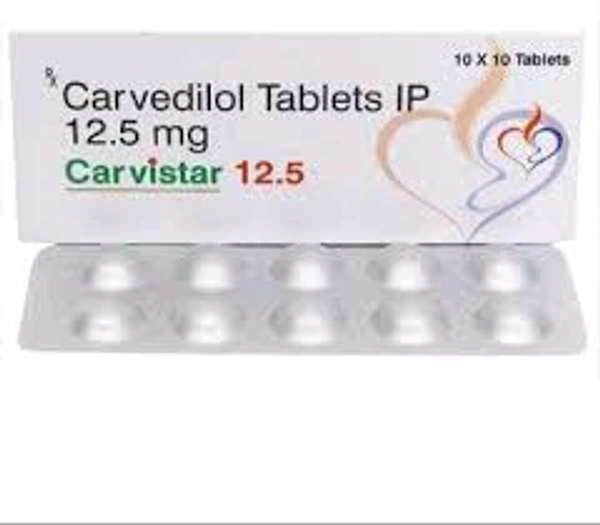 Carvistar 12.5 Tablet is a medicine used to treat high blood pressure, heart-related chest pain (angina), and heart failure. It works by relaxing the blood vessels, so blood can flow more easily to the heart. Lowering blood pressure also helps prevent future heart attacks and stroke.