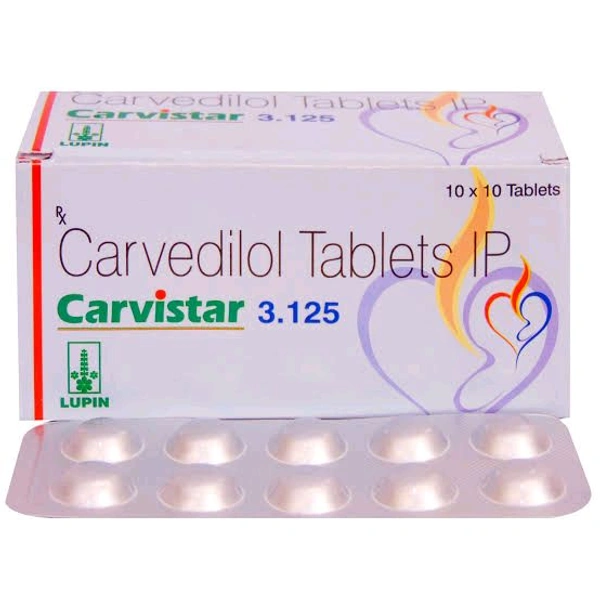 Carvistar 3.125 Tablet is a medicine used to treat high blood pressure, heart-related chest pain (angina), and heart failure. It works by relaxing the blood vessels, so blood can flow more easily to the heart. Lowering blood pressure also helps prevent future heart attacks and stroke.