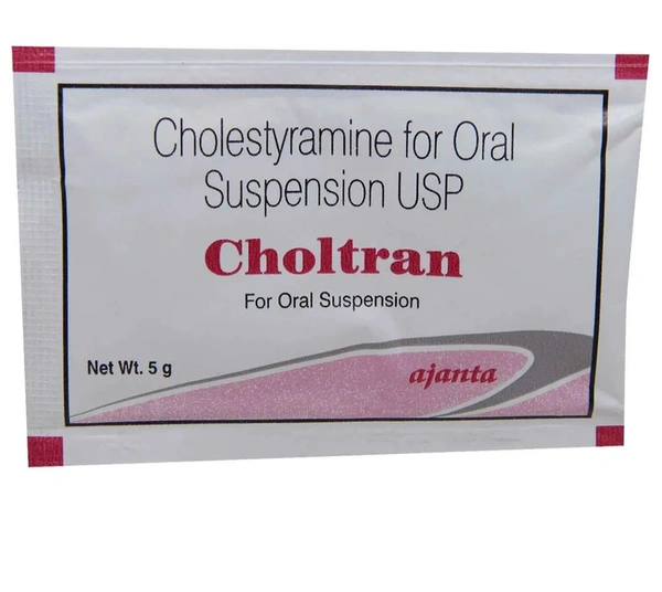 Choltran Powder For Oral Suspension 5 gm is used to treat high cholesterol and reduce the risk of heart attack and stroke. It contains Cholestyramine which works by preventing the reabsorption of bile acids and lowering cholesterol levels. In some cases, this medicine may cause side effects such as constipation, nausea, vomiting, diarrhoea, stomach pain or gas. Inform the doctor if you are pregnant or breastfeeding, taking any other medication, or have any pre-existing medical conditions.