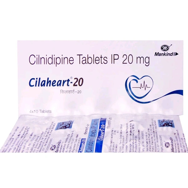 Cilaheart 20 Tablet is used for the treatment of hypertension (high blood pressure) and angina (chest pain). It contains Cilnidipine, which acts by relaxing the blood vessels. This reduces the workload on the heart and makes the heart more efficient at pumping blood throughout the body. Thus, it helps to lower high blood pressure, reducing the chances of heart attack or stroke. It may cause common side effects like headache, feeling exhausted and swollen ankles. Before taking this medicine, you should tell your doctor if you are allergic to any of its components or if you are pregnant/breastfeeding, and about all the medications you are taking and pre-existing medical conditions.