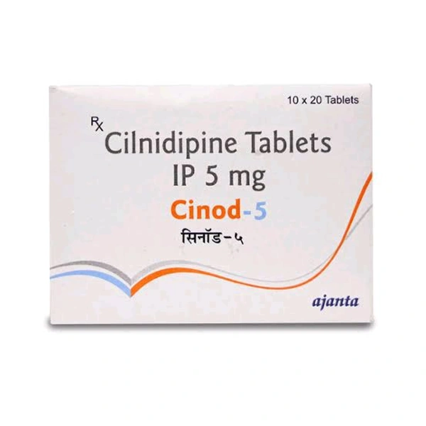 Cinod-5 Tablet is used for the treatment of hypertension (high blood pressure) and angina (chest pain). It contains Cilnidipine, which acts by relaxing the blood vessels. This reduces the workload on the heart and makes the heart more efficient at pumping blood throughout the body. Thus, it helps to lower high blood pressure, reducing the chances of heart attack or stroke. It may cause common side effects like headache, feeling exhausted and swollen ankles. Before taking this medicine, you should tell your doctor if you are allergic to any of its components or if you are pregnant/breastfeeding, and about all the medications you are taking and pre-existing medical conditions.