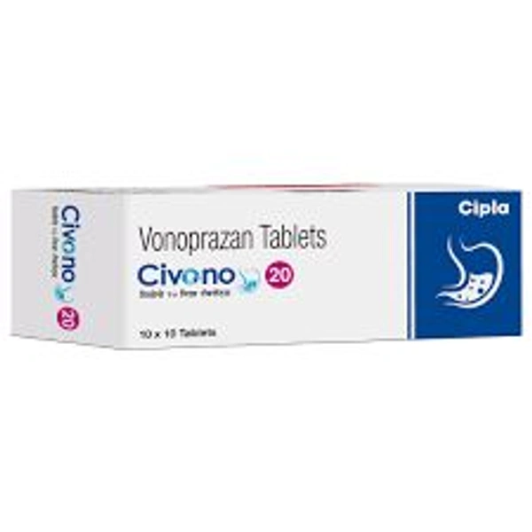 Civono 20 Tablet is a medication used to treat stomach ulcers and gastroesophageal reflux disease (GERD). It works by blocking the proton pumps in the stomach lining that produce acid. By reducing the amount of acid, it helps to heal ulcers and alleviate symptoms of GERD, such as heartburn and acid reflux.