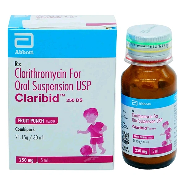 Claribid 250 DS Combipack Fruit Punch Suspension is used to treat a wide range of bacterial infections. It contains Clarithromycin (antibiotic). It inhibits the protein synthesis process required for bacterial cell growth. As a result, bacterial cells are not able to reproduce and grow. Thus, it helps prevent infections. Common side effects of Claribid 250 DS Combipack Fruit Punch Suspension are feeling sick (nausea), diarrhoea and being sick (vomiting), loss of appetite, bloating and indigestion, headaches and difficulty sleeping