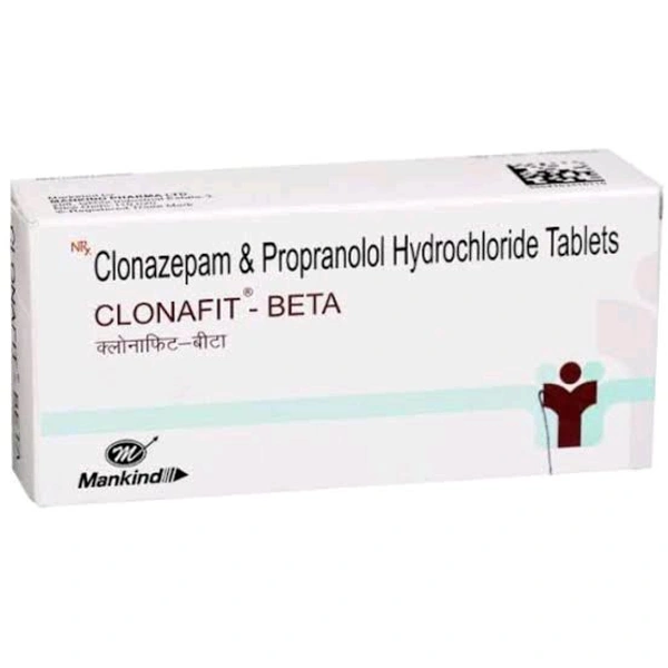 Clonafit Beta Tablet is used to treat anxiety. Besides this, it is also used to treat high blood pressure, panic disorder, seizure disorder, fast heartbeat, and migraine. It contains two medicines, namely Clonazepam and Propranolol. It may cause common side effects, such as dry mouth, slow heart rate, depression, fatigue (overtiredness), nightmares, sleep disturbances, memory impairment, and confusion.
