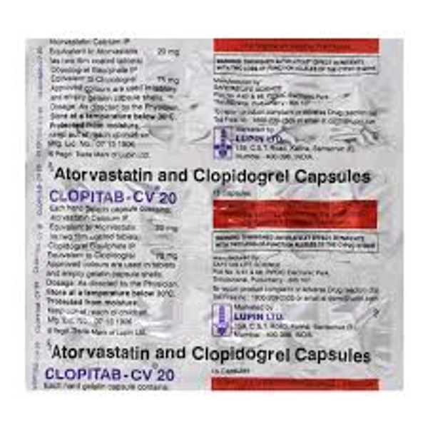 Clopitab-CV 20 Capsule is a combination of two medicines used to prevent heart attack and stroke. This medicine reduces the "bad" cholesterol (LDL) and triglycerides (fats) levels. Moreover, it also decreases the formation of blood clots.