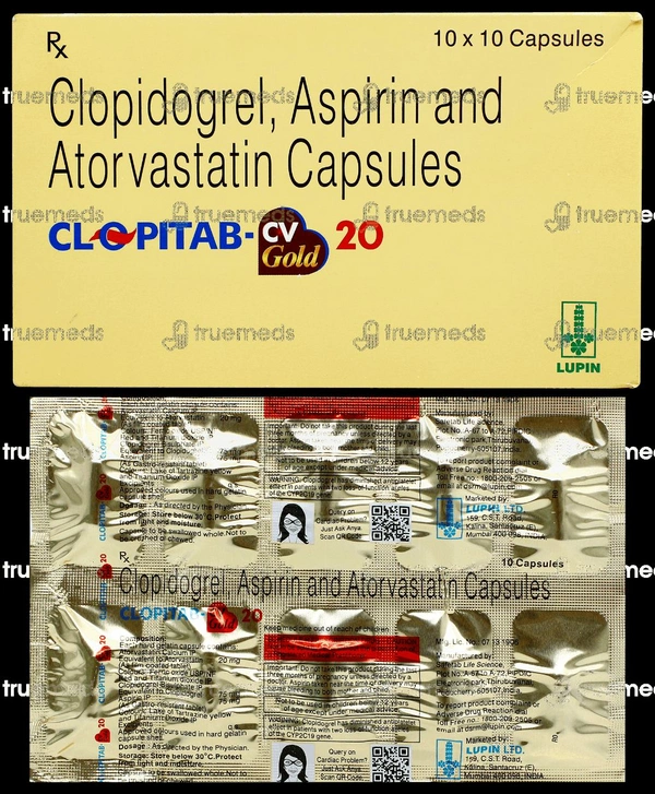 Clopitab-CV Gold 20 Capsule is used for the prevention of heart attack. It is a combination of medicines that prevent clot formation in the blood vessels. It also helps to reduce increased cholesterol and triglycerides levels.