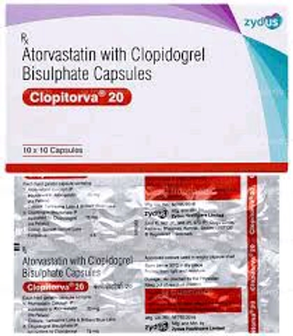 Clopitorva 20 Capsule is a combination of two medicines used to prevent heart attack and stroke. This medicine reduces the "bad" cholesterol (LDL) and triglycerides (fats) levels. Moreover, it also decreases the formation of blood clots.