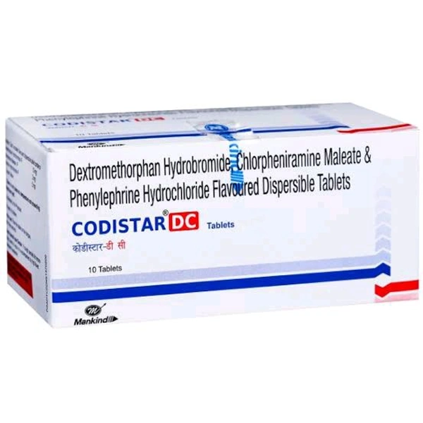 Codistar DC Tablet is used to treat dry cough. It works by blocking the transmission of nerve signals from the cough centre in the brain to the muscles that produce cough. This medicine may sometimes cause side effects such as dry mouth, throat or nose, drowsiness, blurred vision, constipation, dizziness, and restlessness. Inform the doctor if you are pregnant or breastfeeding, taking any other medication, or have any pre-existing medical conditions