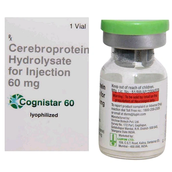 COGNISTAR 60MG INJECTION contains Cerebroprotein Hydrolysate which belongs to group of medicines called Neurotrophic agents. It is used to manage cranial injury, aprosexia (inability to concentrate) in dementia, cerebrovascular disease that includes stroke, and Alzheimer's disease.