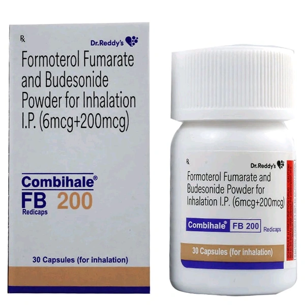 Combihale FB 200 Redicaps is used to treat asthma symptoms and chronic obstructive pulmonary diseases (COPD). It contains Budesonide and Formoterol, which works by reducing the irritation and swelling by acting inside the nasal passage and airways lining cells and stopping the release of certain chemicals responsible for causing inflammatory reactions and allergies. Thereby, it provides relief from sneezing, runny or blocked nose and sinus discomfort. Also, it relaxes and widens respiratory airway muscles, making it easier for asthma and COPD patients to breathe. Some people may experience side effects such as fungal infection in the mouth, headache, sore throat, hoarse voice, upper respiratory tract infection, flu, cough, back pain, increased heart rate, and trembling. Before taking this medicine, you should tell your doctor if you are allergic to any of its components or if you are pregnant/breastfeeding, and about all the medications you are taking and pre-existing medical conditions