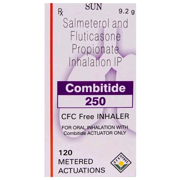 Combitide 250 Inhaler 120 mdi is used to treat and prevent respiratory disorders, such as asthma attacks and chronic obstructive pulmonary disease (COPD). It contains Salmeterol and Fluticasone, which relax the muscles in the airways and increase airflow to the lungs. It makes breathing easier by widening the airways. Also, it acts by blocking the production of prostaglandins (chemical messengers) that cause inflammation (swelling) of the airways. It may cause common side effects such as nausea, vomiting, respiratory tract infection, headache, sore throat, cough, bone, muscle or joint pain, increased heart rate, chills, black or tarry stools, and noisy breathing. Before taking this medicine, you should tell your doctor if you are allergic to any of its components or if you are pregnant/breastfeeding, and about all the medications you are taking and pre-existing medical conditions.